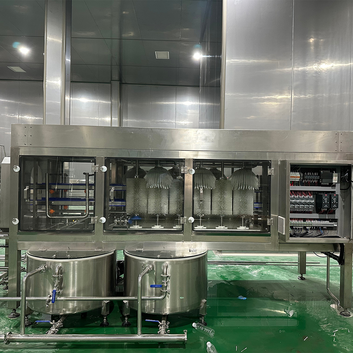 Cleans the outer surface of bottles using rotating brushes and spray systems to remove dirt, label residues, and contaminants, providing a clean surface before internal washing and filling.